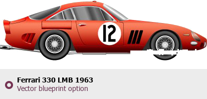 Raster blueprint of the 1963 Ferrari 330 LMB Tag. This free downloadable image can be used for graphic projects, digital design, and 3D modeling. The file provides accurate exterior proportions of the vehicle. Model year: 1963. Body type: Tag.