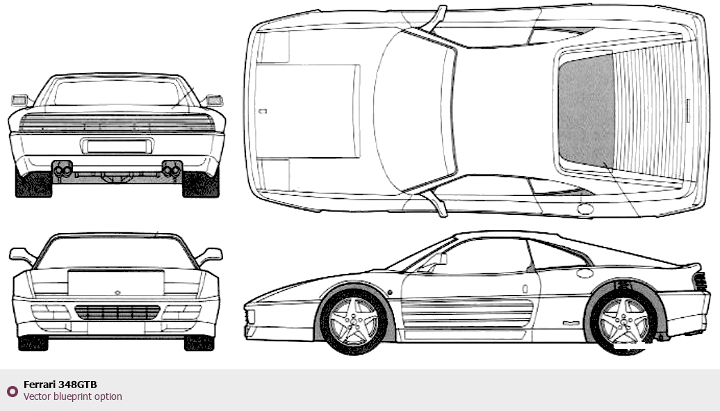 Raster blueprint of the Ferrari 348GTB Tag. This free downloadable image can be used for graphic projects, digital design, and 3D modeling. The file provides accurate exterior proportions of the vehicle. Body type: Tag.
