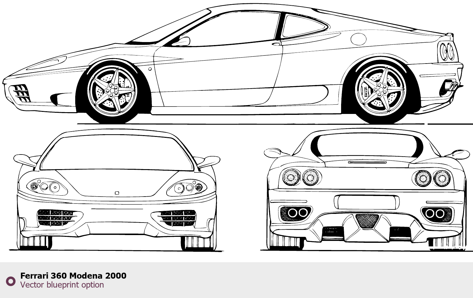 Raster blueprint of the 2000 Ferrari 360 Modena Tag. This free downloadable image can be used for graphic projects, digital design, and 3D modeling. The file provides accurate exterior proportions of the vehicle. Model year: 2000. Body type: Tag.