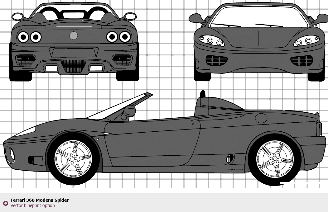 Raster blueprint of the Ferrari 360 Modena Spider Roadster. This free downloadable image can be used for graphic projects, digital design, and 3D modeling. The file provides accurate exterior proportions of the vehicle. Body type: Roadster.