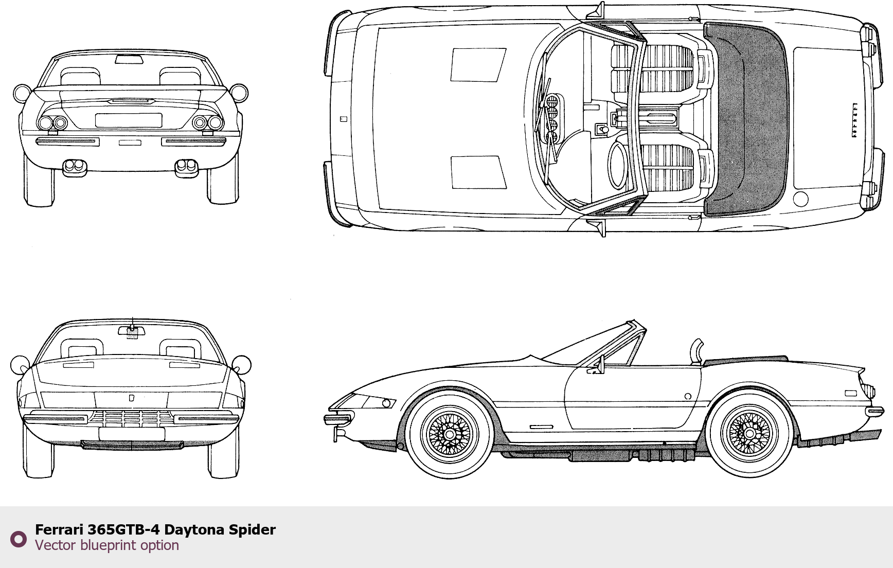 Raster blueprint of the Ferrari 365GTB-4 Daytona Spider Roadster. This free downloadable image can be used for graphic projects, digital design, and 3D modeling. The file provides accurate exterior proportions of the vehicle. Body type: Roadster.
