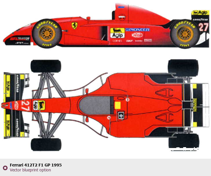Raster blueprint of the 1995 Ferrari 412T2 F1 GP Formula. This free downloadable image can be used for graphic projects, digital design, and 3D modeling. The file provides accurate exterior proportions of the vehicle. Model year: 1995. Body type: Formula.