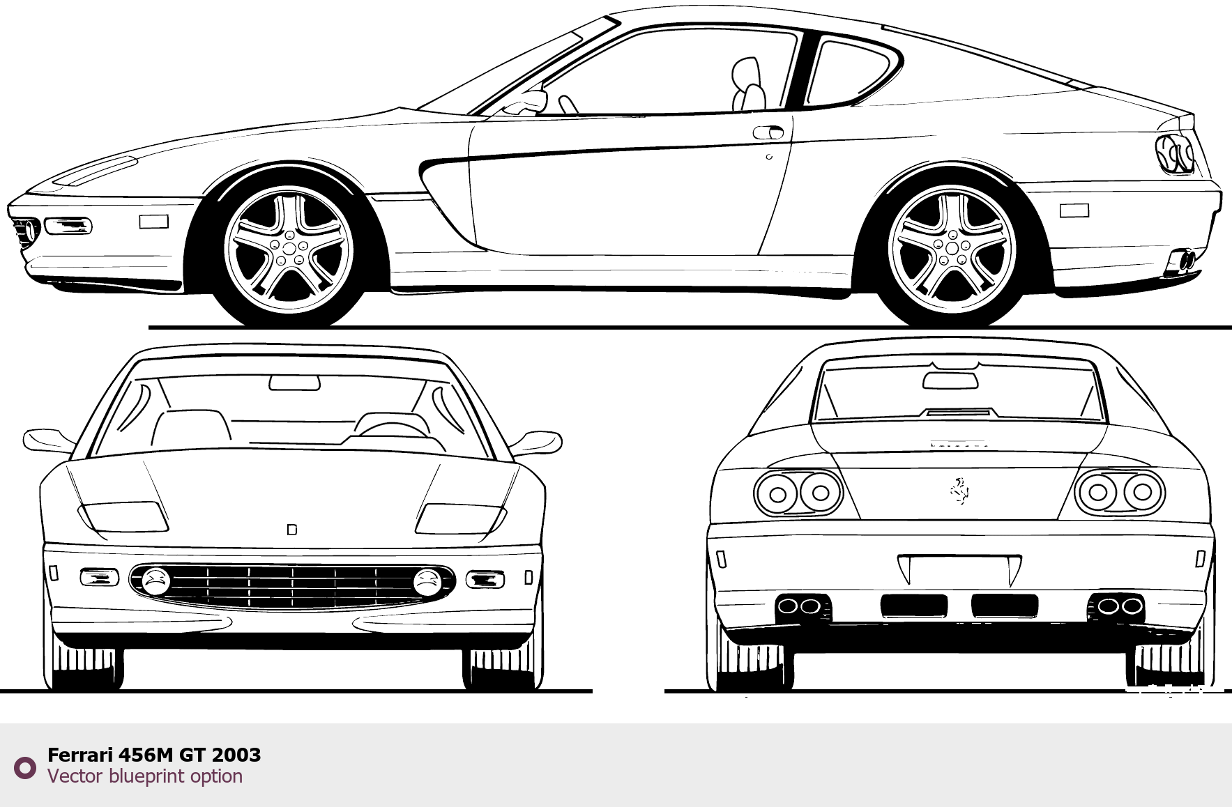 Raster blueprint of the 2003 Ferrari 456M GT Tag. This free downloadable image can be used for graphic projects, digital design, and 3D modeling. The file provides accurate exterior proportions of the vehicle. Model year: 2003. Body type: Tag.