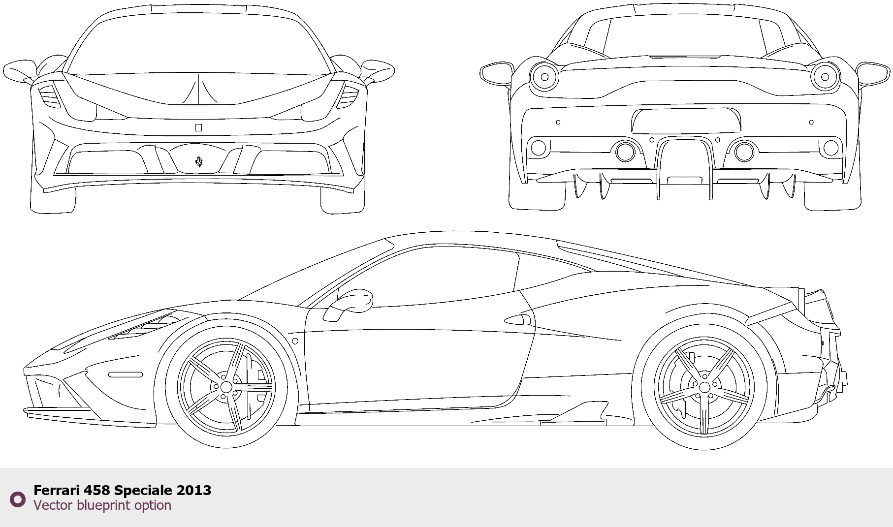 Raster blueprint of the 2013 Ferrari 458 Speciale Tag. This free downloadable image can be used for graphic projects, digital design, and 3D modeling. The file provides accurate exterior proportions of the vehicle. Model year: 2013. Body type: Tag.