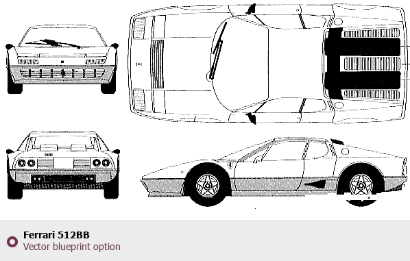 Raster blueprint of the Ferrari 512BB Coupe. This free downloadable image can be used for graphic projects, digital design, and 3D modeling. The file provides accurate exterior proportions of the vehicle. Body type: Coupe.
