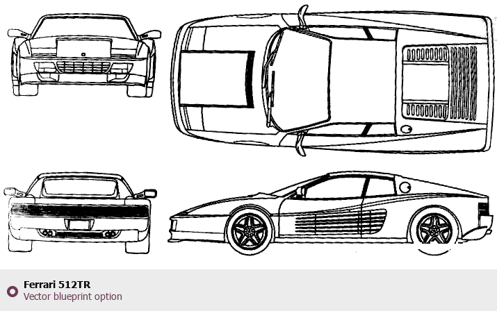Raster blueprint of the Ferrari 512TR Tag. This free downloadable image can be used for graphic projects, digital design, and 3D modeling. The file provides accurate exterior proportions of the vehicle. Body type: Tag.
