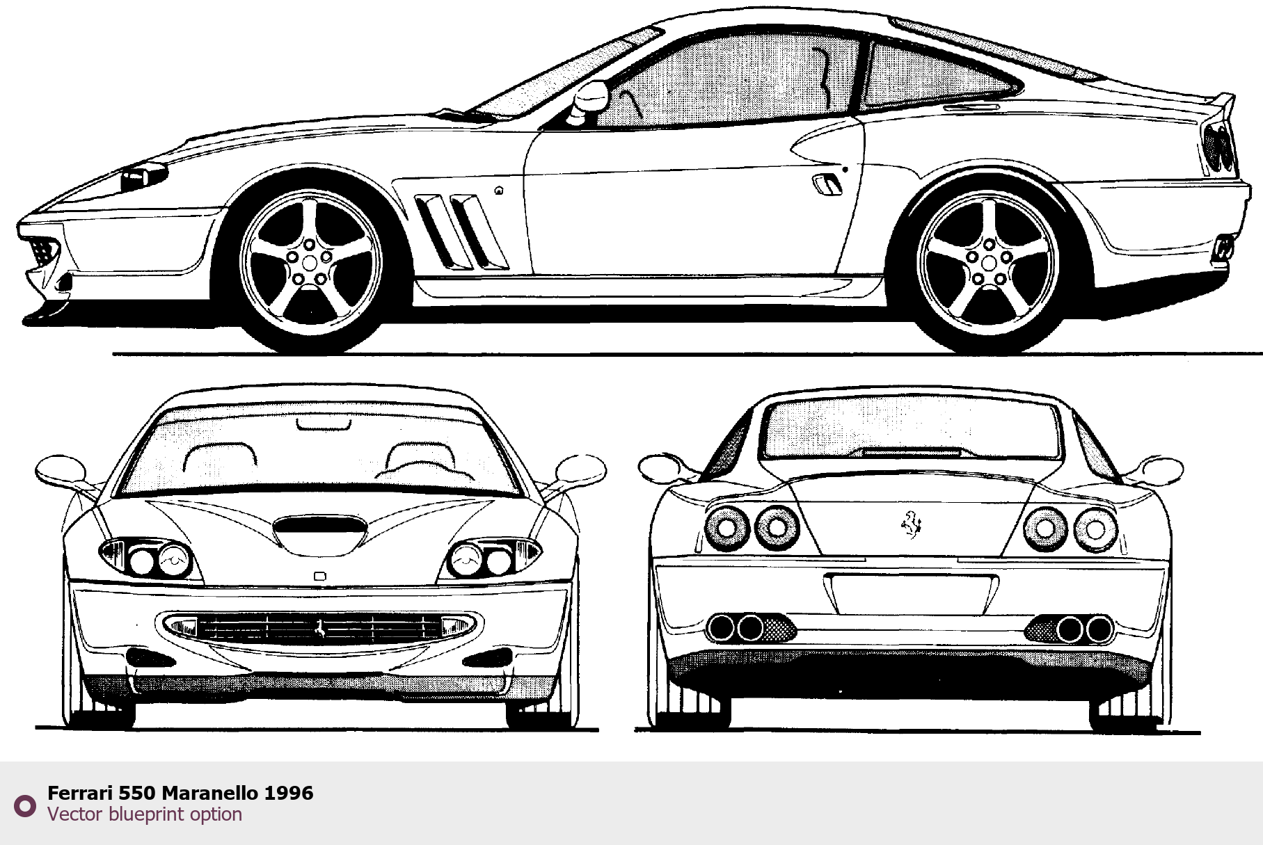 Raster blueprint of the 1996 Ferrari 550 Maranello Tag. This free downloadable image can be used for graphic projects, digital design, and 3D modeling. The file provides accurate exterior proportions of the vehicle. Model year: 1996. Body type: Tag.