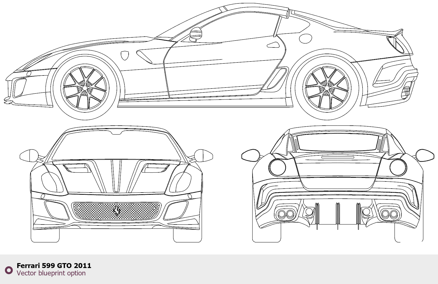 Raster blueprint of the 2011 Ferrari 599 GTO Coupe. This free downloadable image can be used for graphic projects, digital design, and 3D modeling. The file provides accurate exterior proportions of the vehicle. Model year: 2011. Body type: Coupe.