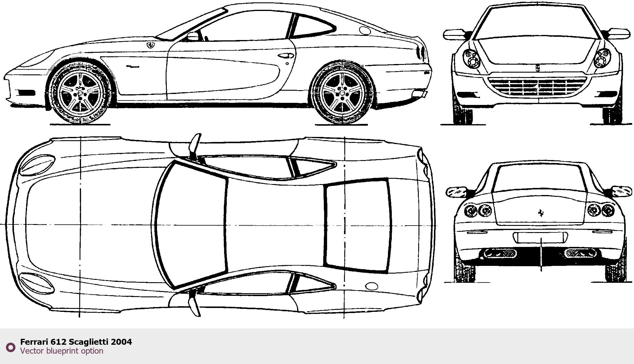 Raster blueprint of the 2004 Ferrari 612 Scaglietti Coupe. This free downloadable image can be used for graphic projects, digital design, and 3D modeling. The file provides accurate exterior proportions of the vehicle. Model year: 2004. Body type: Coupe.
