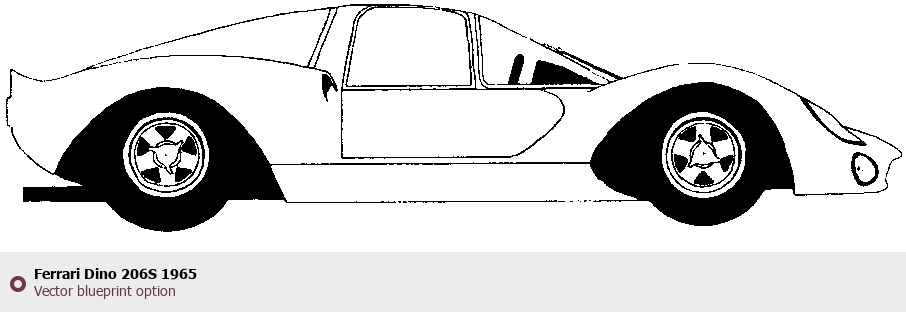 Raster blueprint of the 1965 Ferrari Dino 206S Coupe. This free downloadable image can be used for graphic projects, digital design, and 3D modeling. The file provides accurate exterior proportions of the vehicle. Model year: 1965. Body type: Coupe.