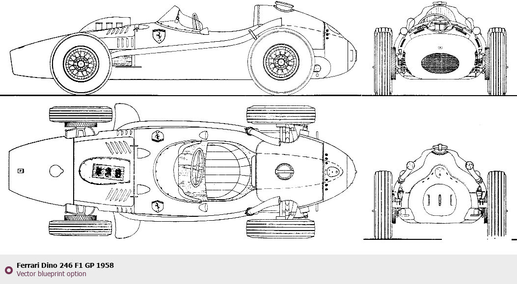Raster blueprint of the 1958 Ferrari Dino 246 F1 GP Coupe. This free downloadable image can be used for graphic projects, digital design, and 3D modeling. The file provides accurate exterior proportions of the vehicle. Model year: 1958. Body type: Coupe.