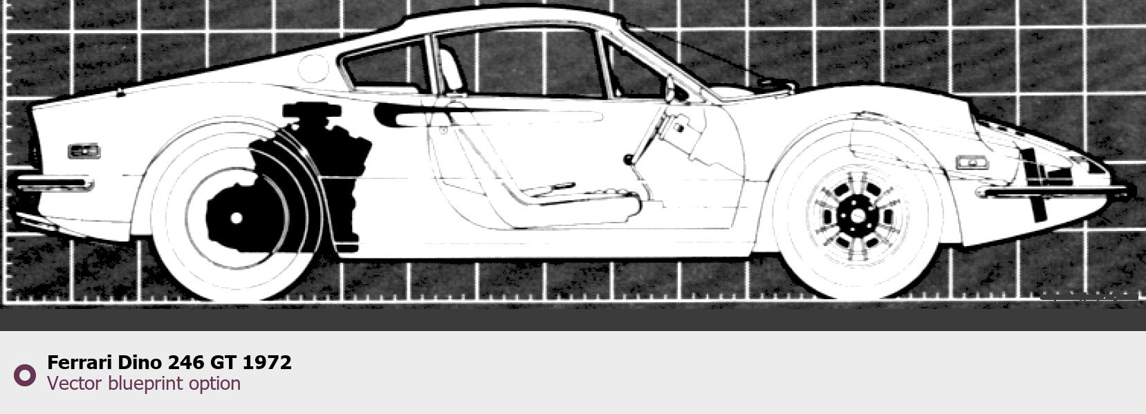 Raster blueprint of the 1972 Ferrari Dino 246 GT Coupe. This free downloadable image can be used for graphic projects, digital design, and 3D modeling. The file provides accurate exterior proportions of the vehicle. Model year: 1972. Body type: Coupe.