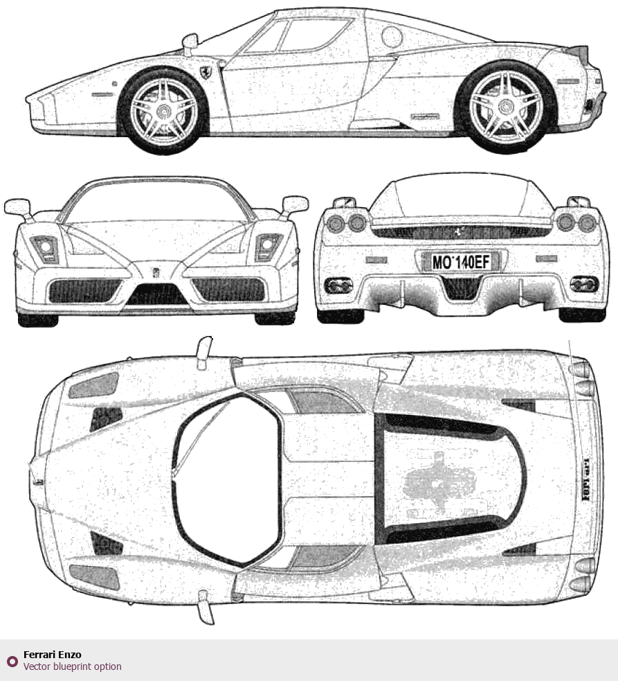Raster blueprint of the Ferrari Enzo Coupe. This free downloadable image can be used for graphic projects, digital design, and 3D modeling. The file provides accurate exterior proportions of the vehicle. Body type: Coupe.