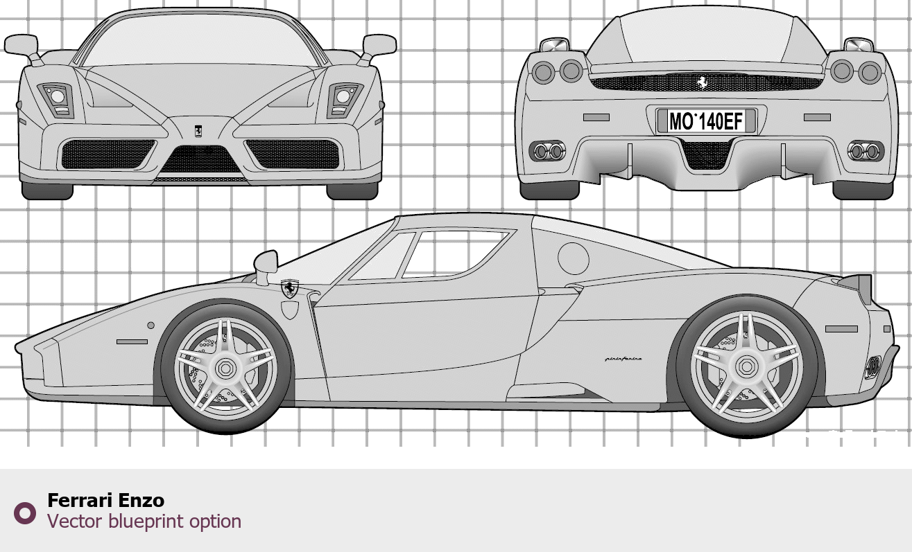 Raster blueprint of the Ferrari Enzo Coupe. This free downloadable image can be used for graphic projects, digital design, and 3D modeling. The file provides accurate exterior proportions of the vehicle. Body type: Coupe.