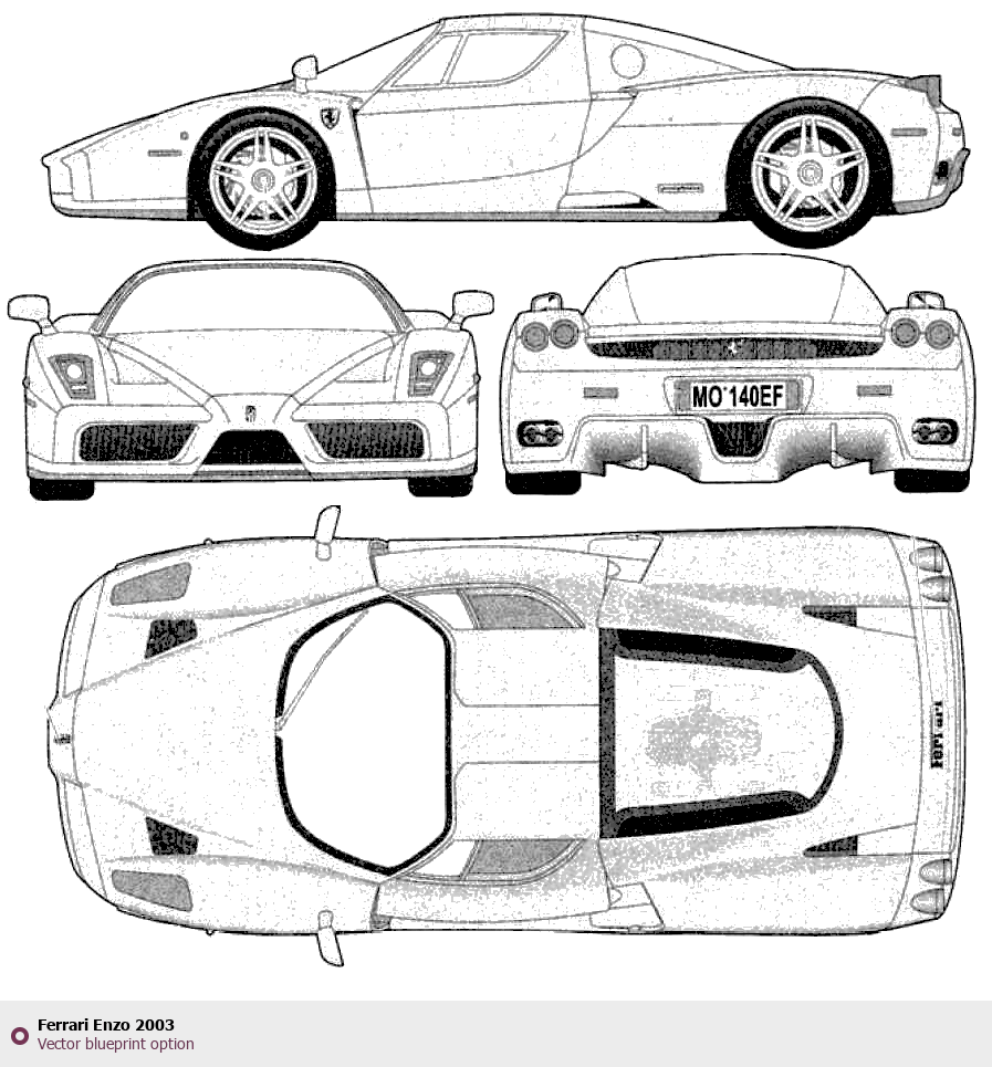 Raster blueprint of the 2003 Ferrari Enzo Coupe. This free downloadable image can be used for graphic projects, digital design, and 3D modeling. The file provides accurate exterior proportions of the vehicle. Model year: 2003. Body type: Coupe.