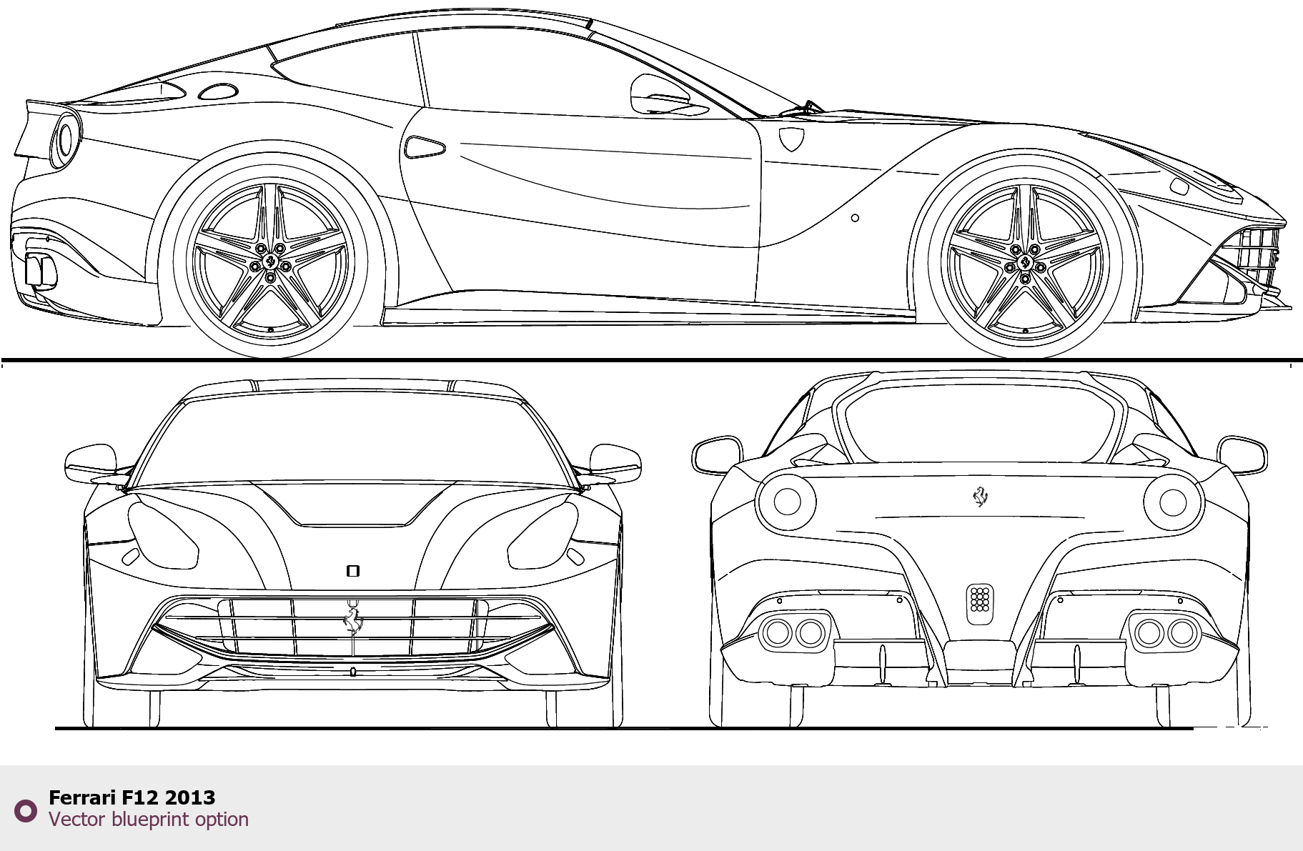 Raster blueprint of the 2013 Ferrari F12 Coupe. This free downloadable image can be used for graphic projects, digital design, and 3D modeling. The file provides accurate exterior proportions of the vehicle. Model year: 2013. Body type: Coupe.