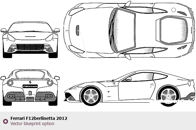 Raster blueprint of the 2012 Ferrari F12berlinetta Coupe. This free downloadable image can be used for graphic projects, digital design, and 3D modeling. The file provides accurate exterior proportions of the vehicle. Model year: 2012. Body type: Coupe.