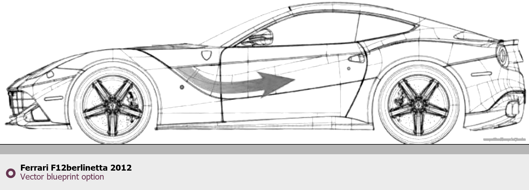 Raster blueprint of the 2012 Ferrari F12berlinetta Coupe. This free downloadable image can be used for graphic projects, digital design, and 3D modeling. The file provides accurate exterior proportions of the vehicle. Model year: 2012. Body type: Coupe.