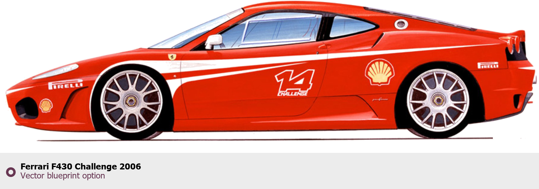 Raster blueprint of the 2006 Ferrari F430 Challenge Coupe. This free downloadable image can be used for graphic projects, digital design, and 3D modeling. The file provides accurate exterior proportions of the vehicle. Model year: 2006. Body type: Coupe.