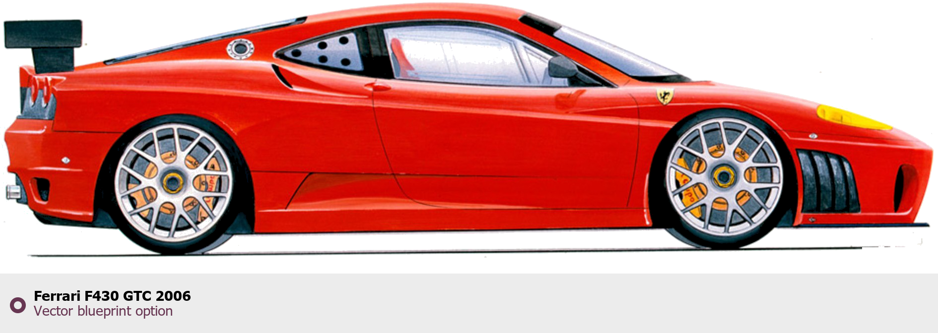 Raster blueprint of the 2006 Ferrari F430 GTC Coupe. This free downloadable image can be used for graphic projects, digital design, and 3D modeling. The file provides accurate exterior proportions of the vehicle. Model year: 2006. Body type: Coupe.