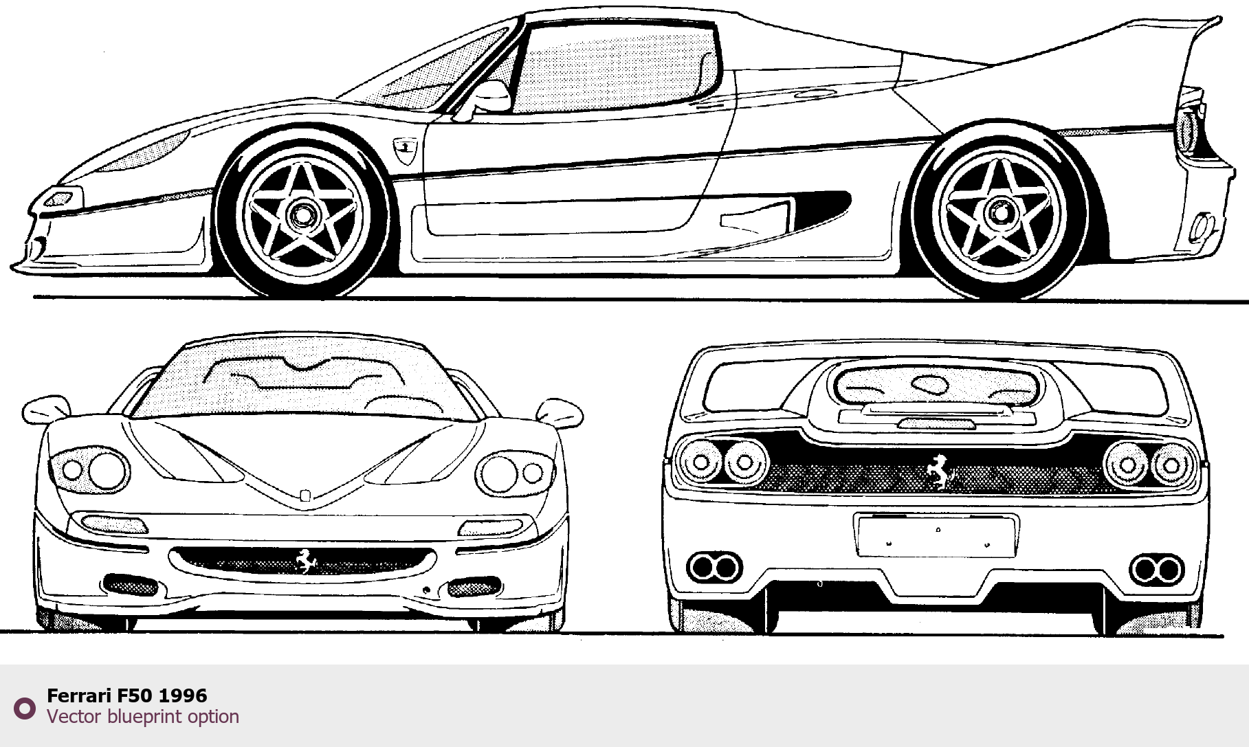 Raster blueprint of the 1996 Ferrari F50 Coupe. This free downloadable image can be used for graphic projects, digital design, and 3D modeling. The file provides accurate exterior proportions of the vehicle. Model year: 1996. Body type: Coupe.