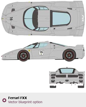 Raster blueprint of the Ferrari FXX Tag. This free downloadable image can be used for graphic projects, digital design, and 3D modeling. The file provides accurate exterior proportions of the vehicle. Body type: Tag.