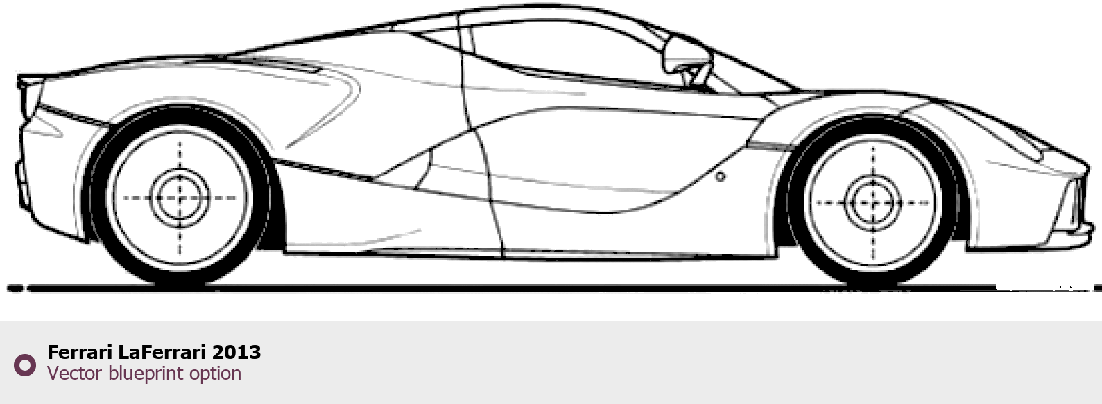 Raster blueprint of the 2013 Ferrari LaFerrari Coupe. This free downloadable image can be used for graphic projects, digital design, and 3D modeling. The file provides accurate exterior proportions of the vehicle. Model year: 2013. Body type: Coupe.