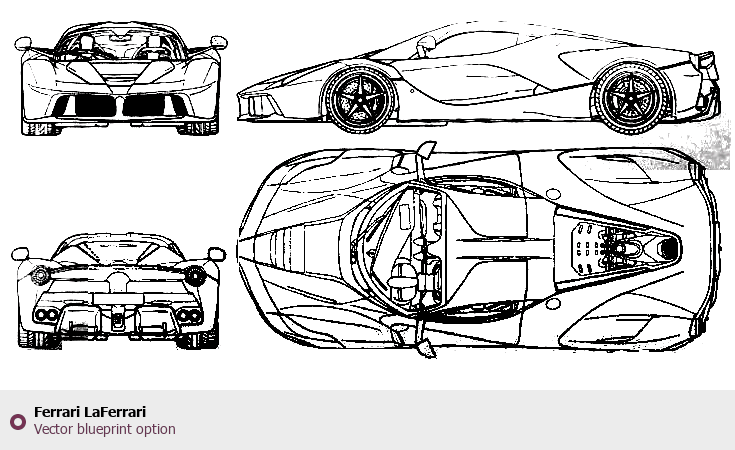 Raster blueprint of the Ferrari LaFerrari Coupe. This free downloadable image can be used for graphic projects, digital design, and 3D modeling. The file provides accurate exterior proportions of the vehicle. Body type: Coupe.