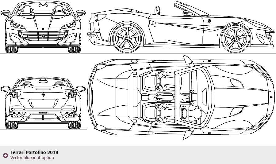 Raster blueprint of the 2018 Ferrari Portofino Tag. This free downloadable image can be used for graphic projects, digital design, and 3D modeling. The file provides accurate exterior proportions of the vehicle. Model year: 2018. Body type: Tag.