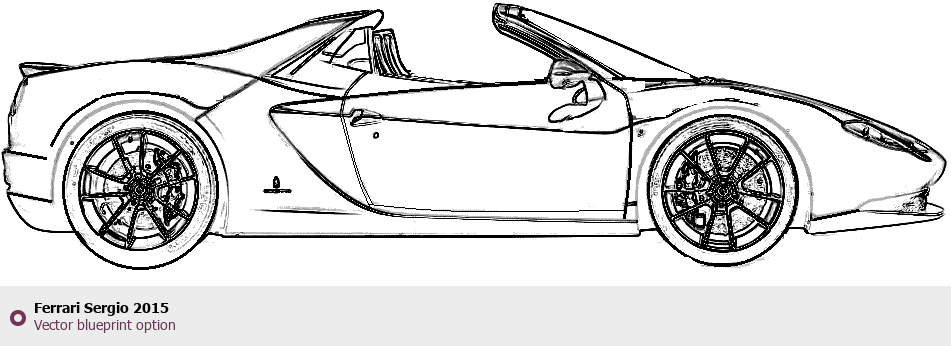 Raster blueprint of the 2015 Ferrari Sergio Tag. This free downloadable image can be used for graphic projects, digital design, and 3D modeling. The file provides accurate exterior proportions of the vehicle. Model year: 2015. Body type: Tag.