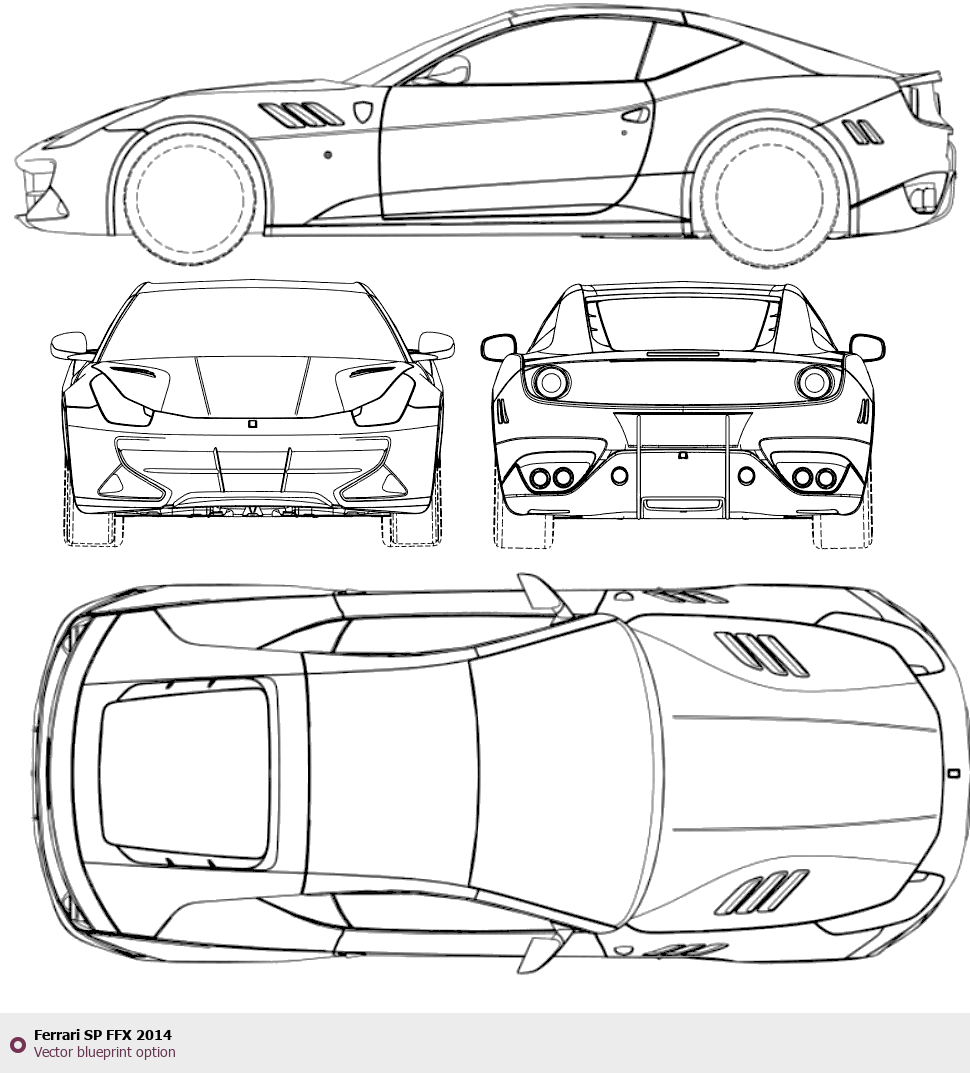 Raster blueprint of the 2014 Ferrari SP FFX Hatchback. This free downloadable image can be used for graphic projects, digital design, and 3D modeling. The file provides accurate exterior proportions of the vehicle. Model year: 2014. Body type: Hatchback.