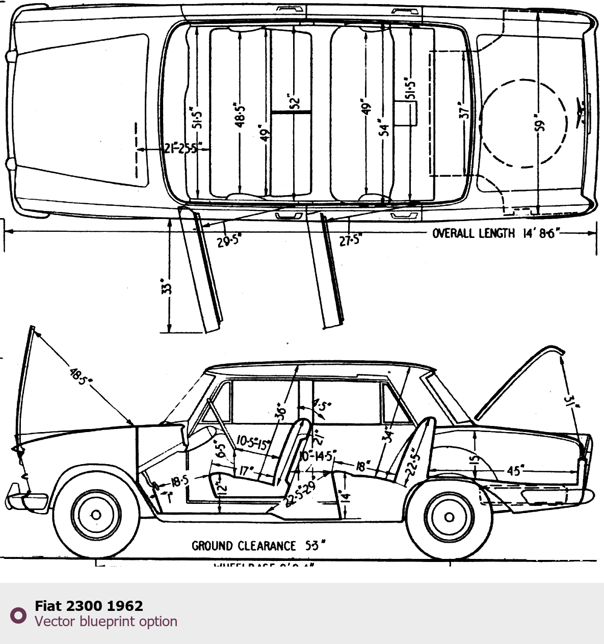 Raster blueprint of the 1962 Fiat 2300 Tag. This free downloadable image can be used for graphic projects, digital design, and 3D modeling. The file provides accurate exterior proportions of the vehicle. Model year: 1962. Body type: Tag.