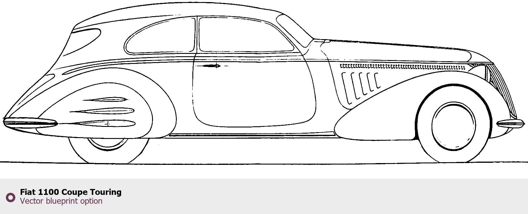 Raster blueprint of the Fiat 1100 Coupe Touring Sedan. This free downloadable image can be used for graphic projects, digital design, and 3D modeling. The file provides accurate exterior proportions of the vehicle. Body type: Sedan.