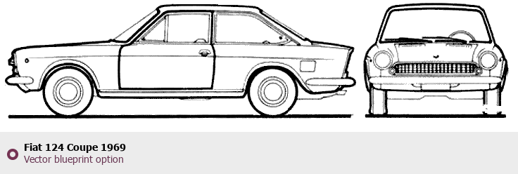 Raster blueprint of the 1969 Fiat 124 Coupe Coupe. This free downloadable image can be used for graphic projects, digital design, and 3D modeling. The file provides accurate exterior proportions of the vehicle. Model year: 1969. Body type: Coupe.