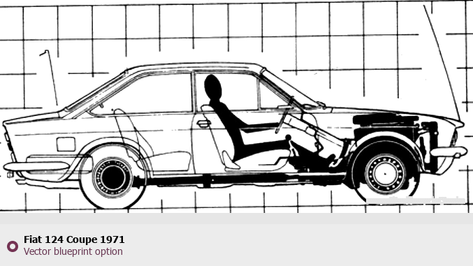 Raster blueprint of the 1971 Fiat 124 Coupe Coupe. This free downloadable image can be used for graphic projects, digital design, and 3D modeling. The file provides accurate exterior proportions of the vehicle. Model year: 1971. Body type: Coupe.