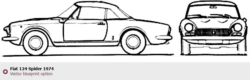 Raster blueprint of the 1974 Fiat 124 Spider Roadster. This free downloadable image can be used for graphic projects, digital design, and 3D modeling. The file provides accurate exterior proportions of the vehicle. Model year: 1974. Body type: Roadster.