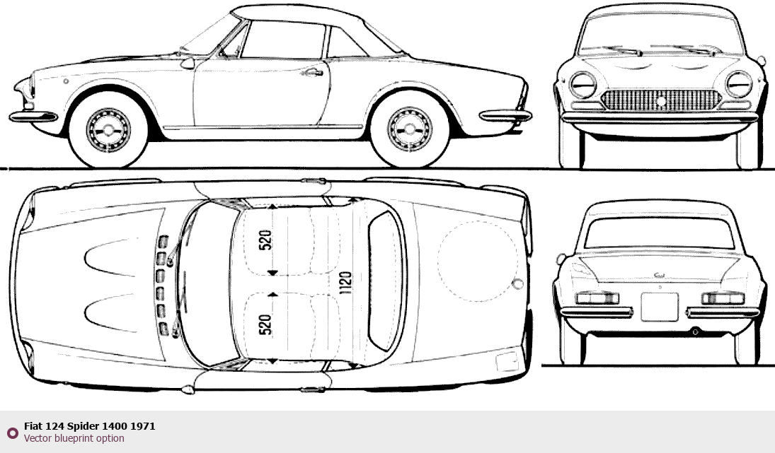 Raster blueprint of the 1971 Fiat 124 Spider 1400 Roadster. This free downloadable image can be used for graphic projects, digital design, and 3D modeling. The file provides accurate exterior proportions of the vehicle. Model year: 1971. Body type: Roadster.
