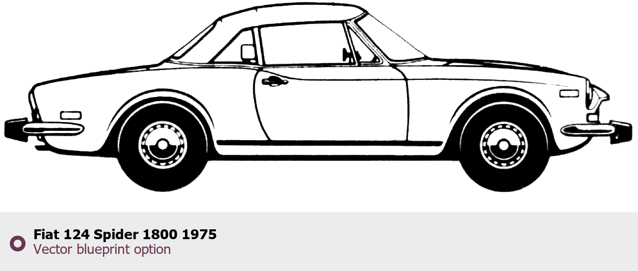 Raster blueprint of the 1975 Fiat 124 Spider 1800 Roadster. This free downloadable image can be used for graphic projects, digital design, and 3D modeling. The file provides accurate exterior proportions of the vehicle. Model year: 1975. Body type: Roadster.