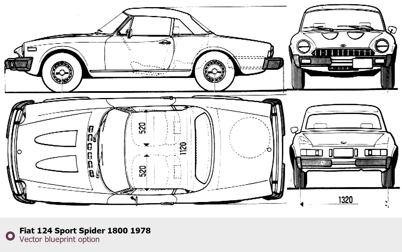 Raster blueprint of the 1978 Fiat 124 Sport Spider 1800 Roadster. This free downloadable image can be used for graphic projects, digital design, and 3D modeling. The file provides accurate exterior proportions of the vehicle. Model year: 1978. Body type: Roadster.