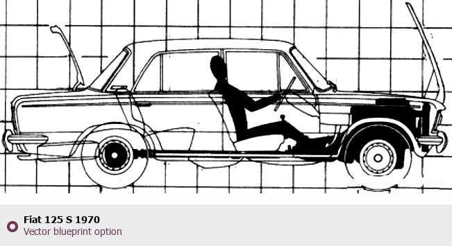 Raster blueprint of the 1970 Fiat 125 S Tag. This free downloadable image can be used for graphic projects, digital design, and 3D modeling. The file provides accurate exterior proportions of the vehicle. Model year: 1970. Body type: Tag.