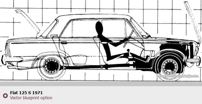 Raster blueprint of the 1971 Fiat 125 S Tag. This free downloadable image can be used for graphic projects, digital design, and 3D modeling. The file provides accurate exterior proportions of the vehicle. Model year: 1971. Body type: Tag.