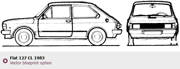 Raster blueprint of the 1983 Fiat 127 CL Hatchback. This free downloadable image can be used for graphic projects, digital design, and 3D modeling. The file provides accurate exterior proportions of the vehicle. Model year: 1983. Body type: Hatchback.