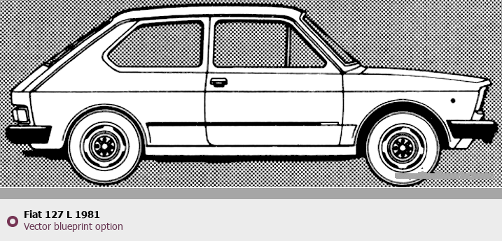 Raster blueprint of the 1981 Fiat 127 L Hatchback. This free downloadable image can be used for graphic projects, digital design, and 3D modeling. The file provides accurate exterior proportions of the vehicle. Model year: 1981. Body type: Hatchback.