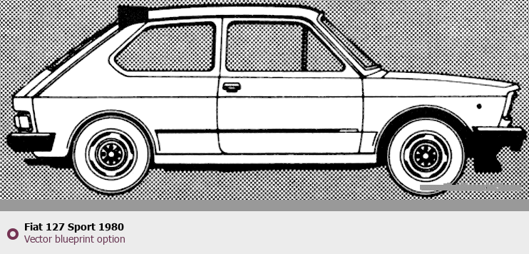 Raster blueprint of the 1980 Fiat 127 Sport Hatchback. This free downloadable image can be used for graphic projects, digital design, and 3D modeling. The file provides accurate exterior proportions of the vehicle. Model year: 1980. Body type: Hatchback.