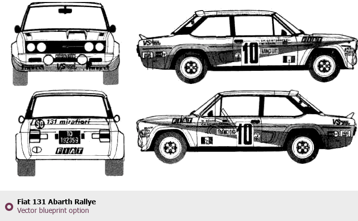 Raster blueprint of the Fiat 131 Abarth Rallye Tag. This free downloadable image can be used for graphic projects, digital design, and 3D modeling. The file provides accurate exterior proportions of the vehicle. Body type: Tag.