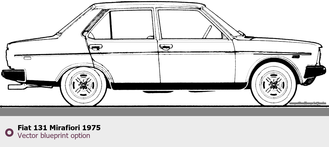 Raster blueprint of the 1975 Fiat 131 Mirafiori Tag. This free downloadable image can be used for graphic projects, digital design, and 3D modeling. The file provides accurate exterior proportions of the vehicle. Model year: 1975. Body type: Tag.