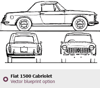 Raster blueprint of the Fiat 1500 Cabriolet Cabriolet. This free downloadable image can be used for graphic projects, digital design, and 3D modeling. The file provides accurate exterior proportions of the vehicle. Body type: Cabriolet.