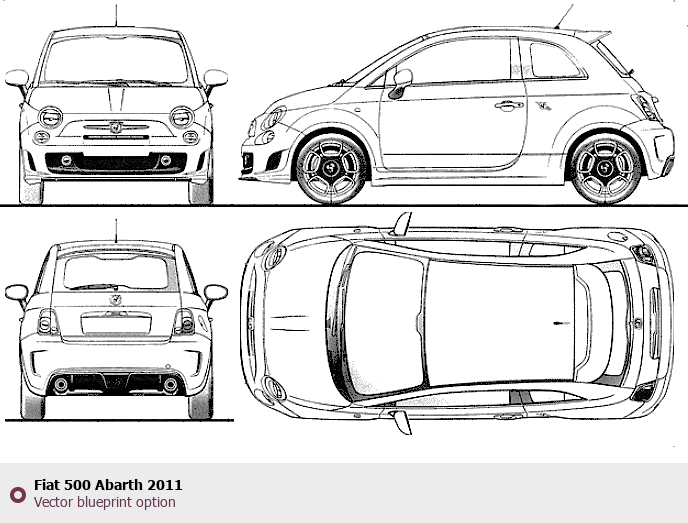 Raster blueprint of the 2011 Fiat 500 Abarth Tag. This free downloadable image can be used for graphic projects, digital design, and 3D modeling. The file provides accurate exterior proportions of the vehicle. Model year: 2011. Body type: Tag.
