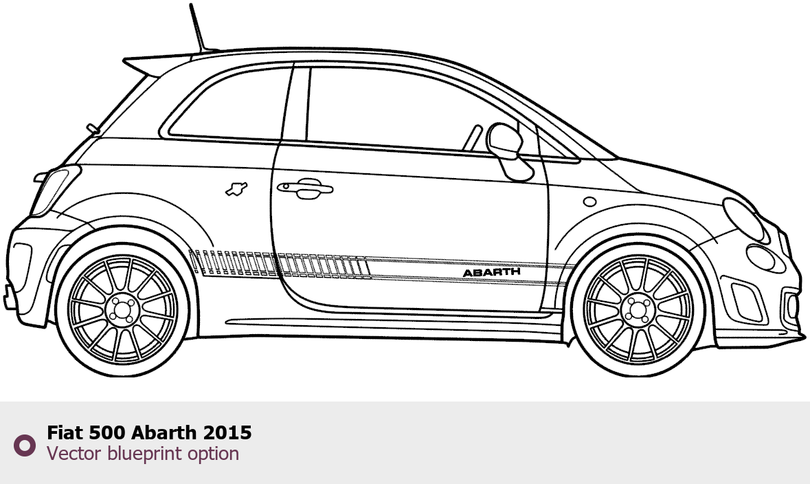Raster blueprint of the 2015 Fiat 500 Abarth Tag. This free downloadable image can be used for graphic projects, digital design, and 3D modeling. The file provides accurate exterior proportions of the vehicle. Model year: 2015. Body type: Tag.