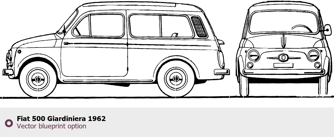 Raster blueprint of the 1962 Fiat 500 Giardiniera Tag. This free downloadable image can be used for graphic projects, digital design, and 3D modeling. The file provides accurate exterior proportions of the vehicle. Model year: 1962. Body type: Tag.